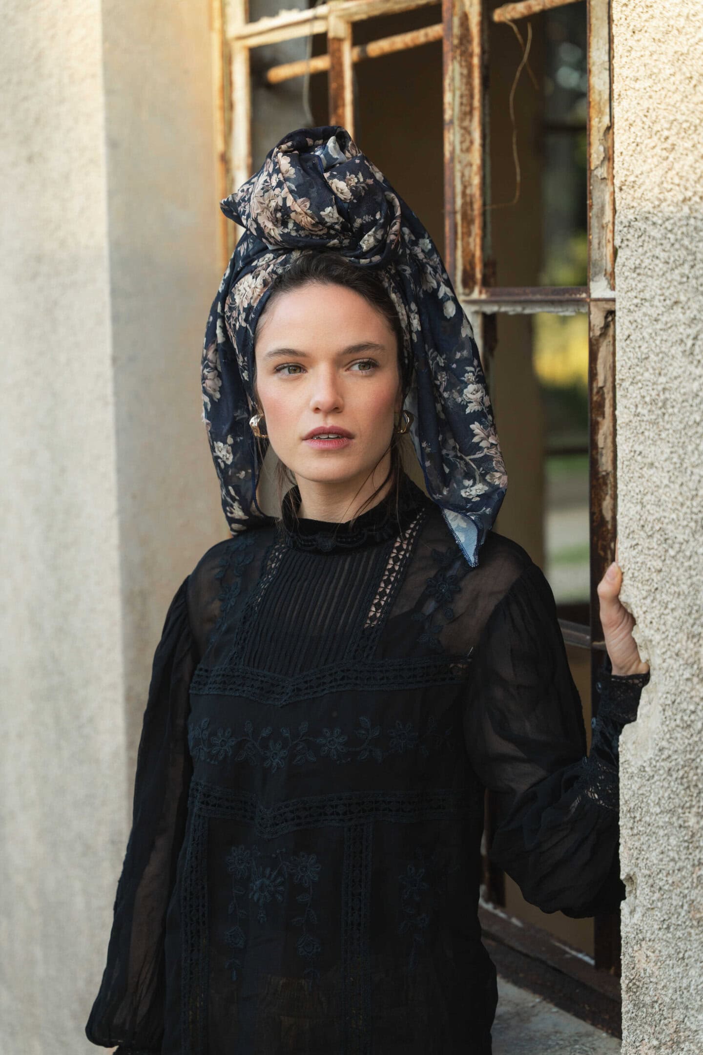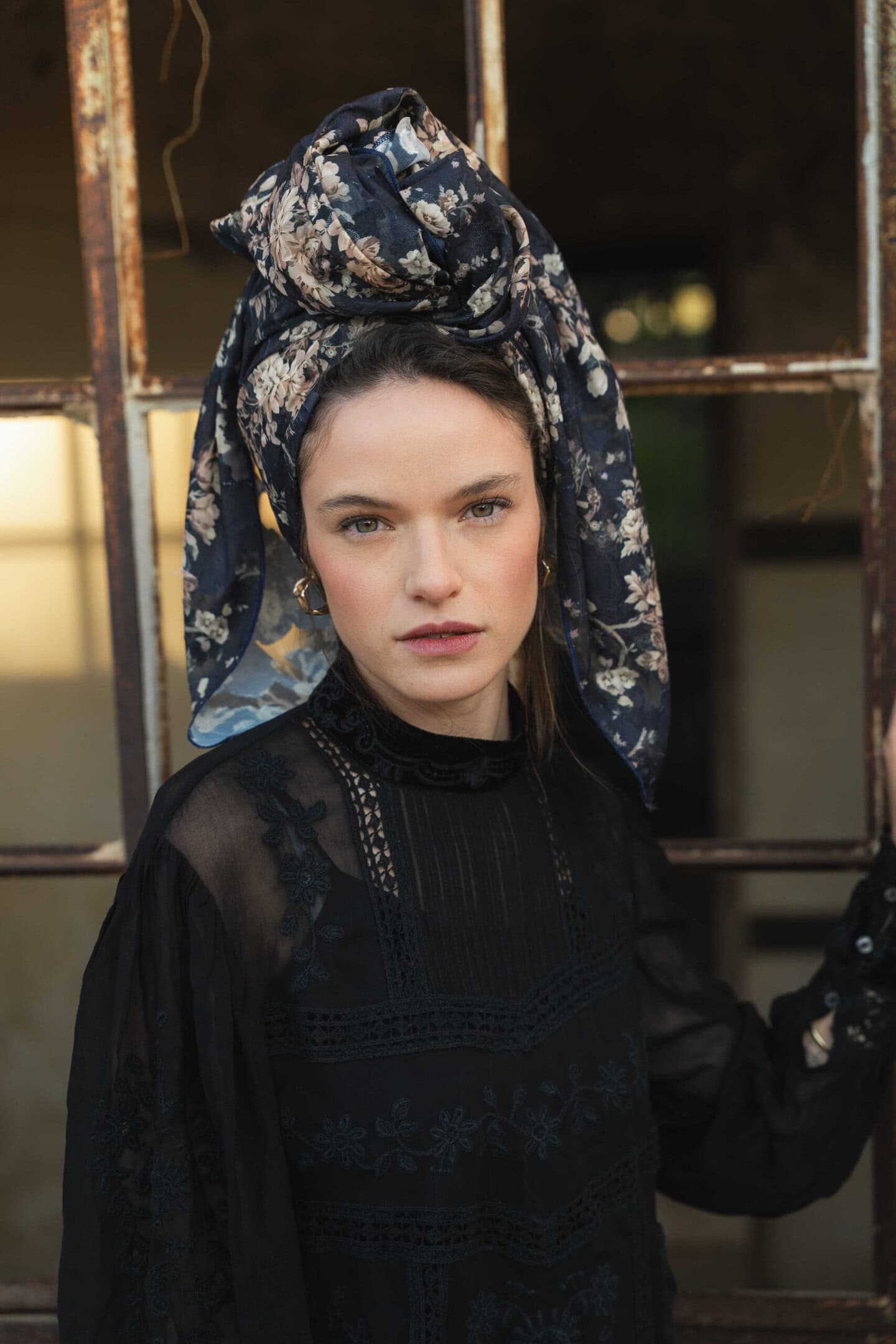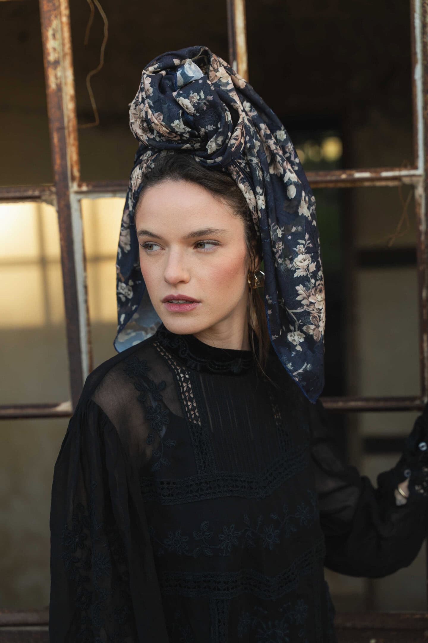 רקע כחול כהה-שחור. מעוטר בהדפס פרחוני עדין בגוונים רכים. אלגנטי על זמני ומלא נוכחות.